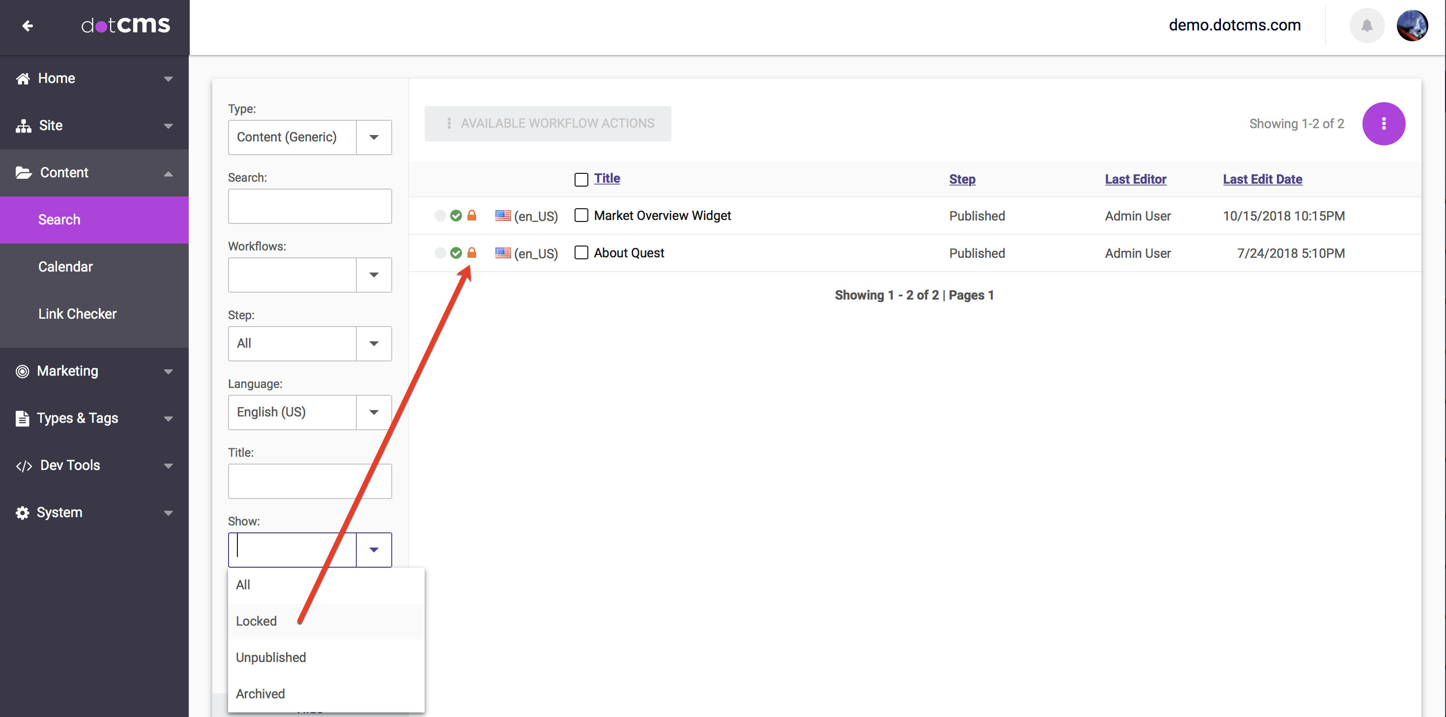 | Archived | Content that is no longer viewable in normal searches on the dotCMS backend. Note: